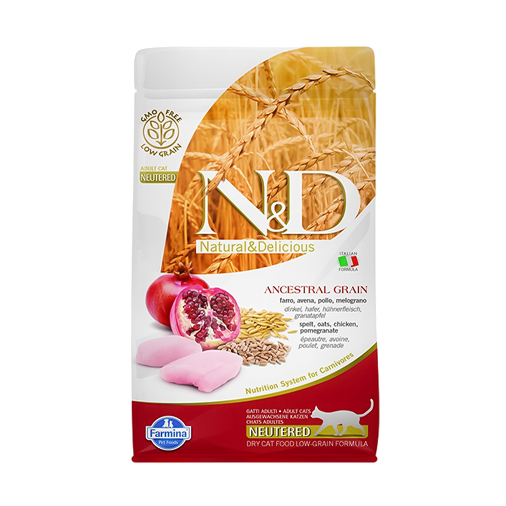 دراي فود فارمينا N & D للقطط المعقمة بالدجاج والرمان والشوفان 1.5 كيلو